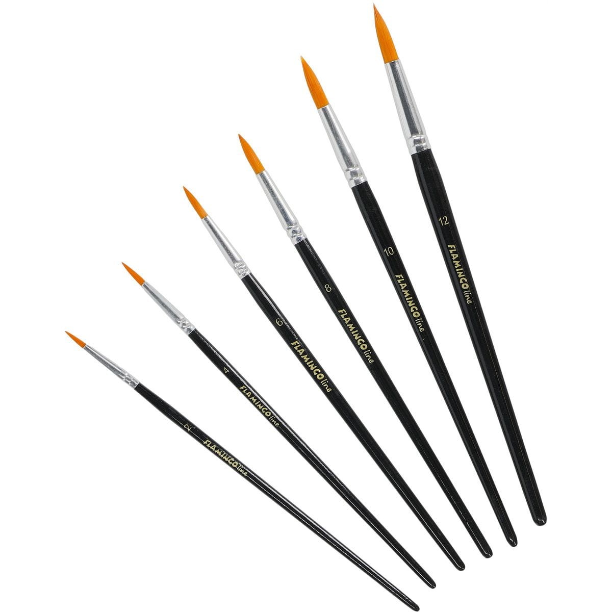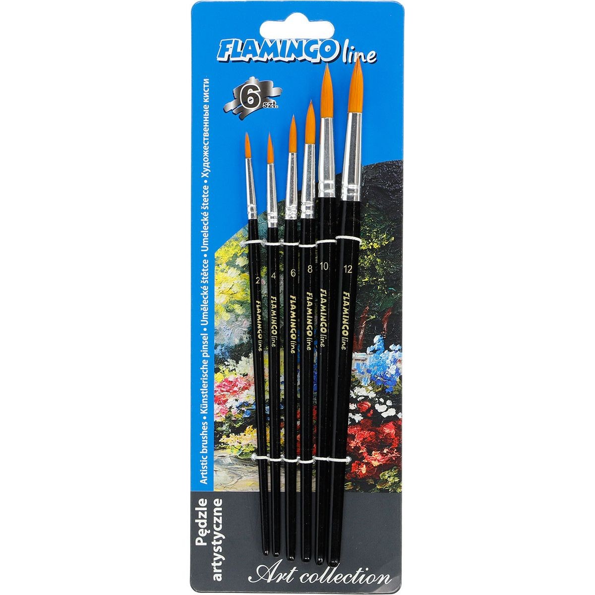 Zestaw 6 pędzli artystycznych z włosiem syntetycznym. Wytrzymałe drewniane uchwyty w czarnym kolorze z oznaczeniem grubości pędzla. Sprawdzą się idealnie zarówno na zajęciach malowania farbami w szkole, jak i w domu. Zestaw zawiera 6 pędzli okrągłych nr: 2, 4, 6, 8, 10, 12.