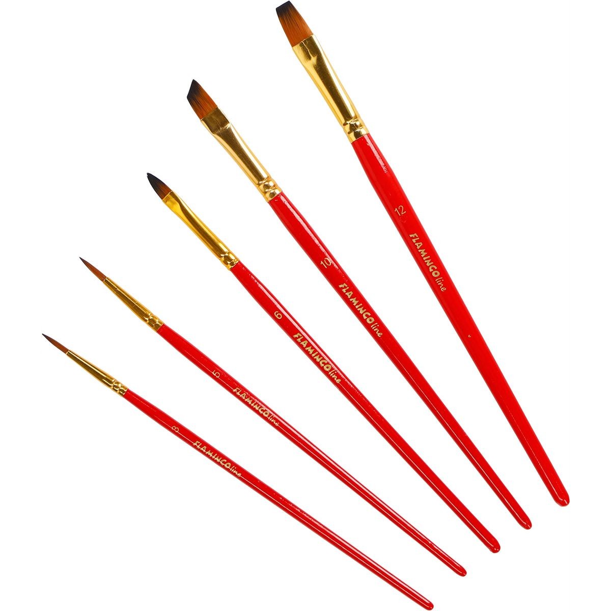 Zestaw 5 pędzli artystycznych z włosiem syntetycznym. Wytrzymały, drewniany uchwyt w czerwonym kolorze z oznaczeniem grubości pędzla. Sprawdzą się idealnie zarówno na zajęciach malowania farbami w szkole, jak i w domu. Do akrylu, jak i do akwareli oraz farb olejnych. Zestaw zawiera 5 pędzli: 3 płaskie i 2 okrągłe. Pędzle okrągłe nr: 3, 5. Pędzle płaskie: 1 z prosto zakończonym włosem nr 12, 1 z ukośnie zakończonym włosem nr 10 oraz 1 zaokrąglony nr 6.